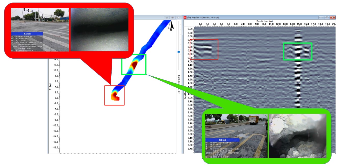 案例分析:经分析,以上发现的14处病害,多沿排水管道分布,病害体可能是排水管道施工时,上覆土层回填不实导致,加上该路段过往车辆以大货车为主,道路上部长期受高频率、超负荷的荷载、碾压、振动,造成路基土层产生扰动、疏松、下沉,形成地下空洞;若不及时发现和修复,后期路面结构层就会陆续开裂、破坏,最后导致路面沉陷破坏。